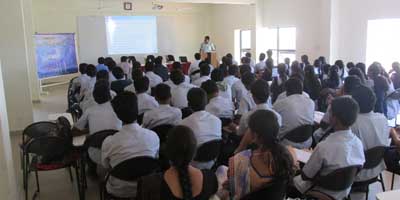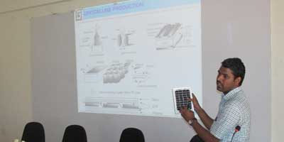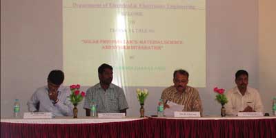 Chief Guest and Resource Person Mr. Prabhuraj Harakangi, Senior Engineer-Electrical, Glentec Engineering Services LLP, Bangalore started the session by giving introduction on Solar photo voltaics. Giving information on the photovoltaic films he explained about the crystalline production. Demonstrating a model he showed the difference between monocrystalline and polycrystalline Solar P.V cells. He gave insights to vaccum deposition technology, I-V curve , power curve and how a panel is designed. He explained about the type of Solar PV systems and emphasised on grid tied system. Giving extensive information about the process to set up a solar plant, he spoke on the different facilities in India. He concluded the session by giving examples on Solar generation as one of the booming industry in India .